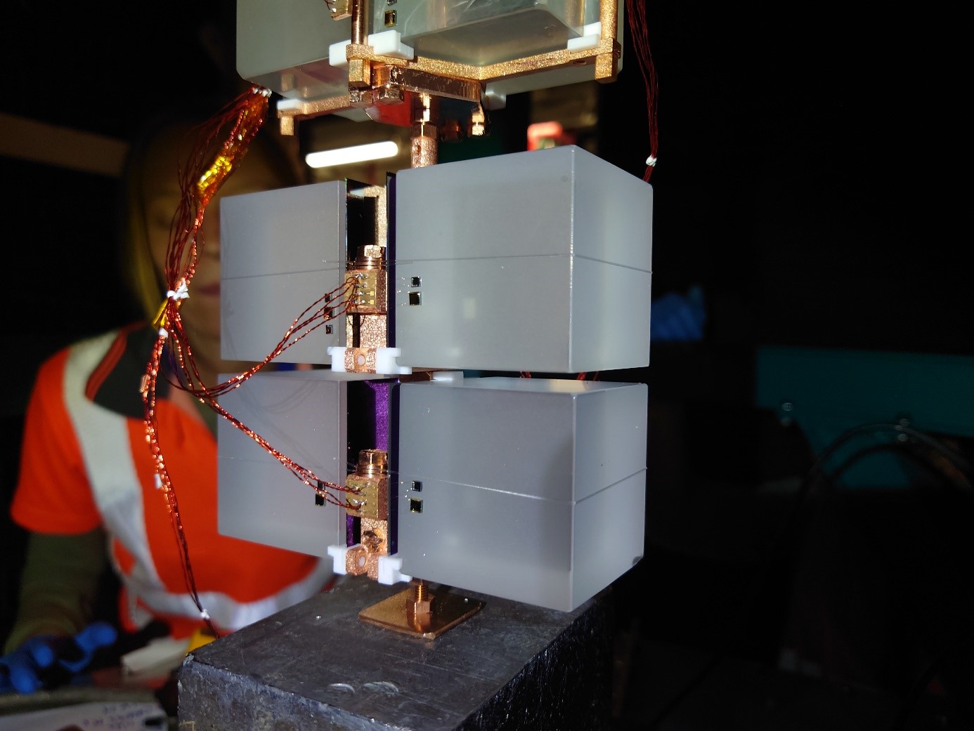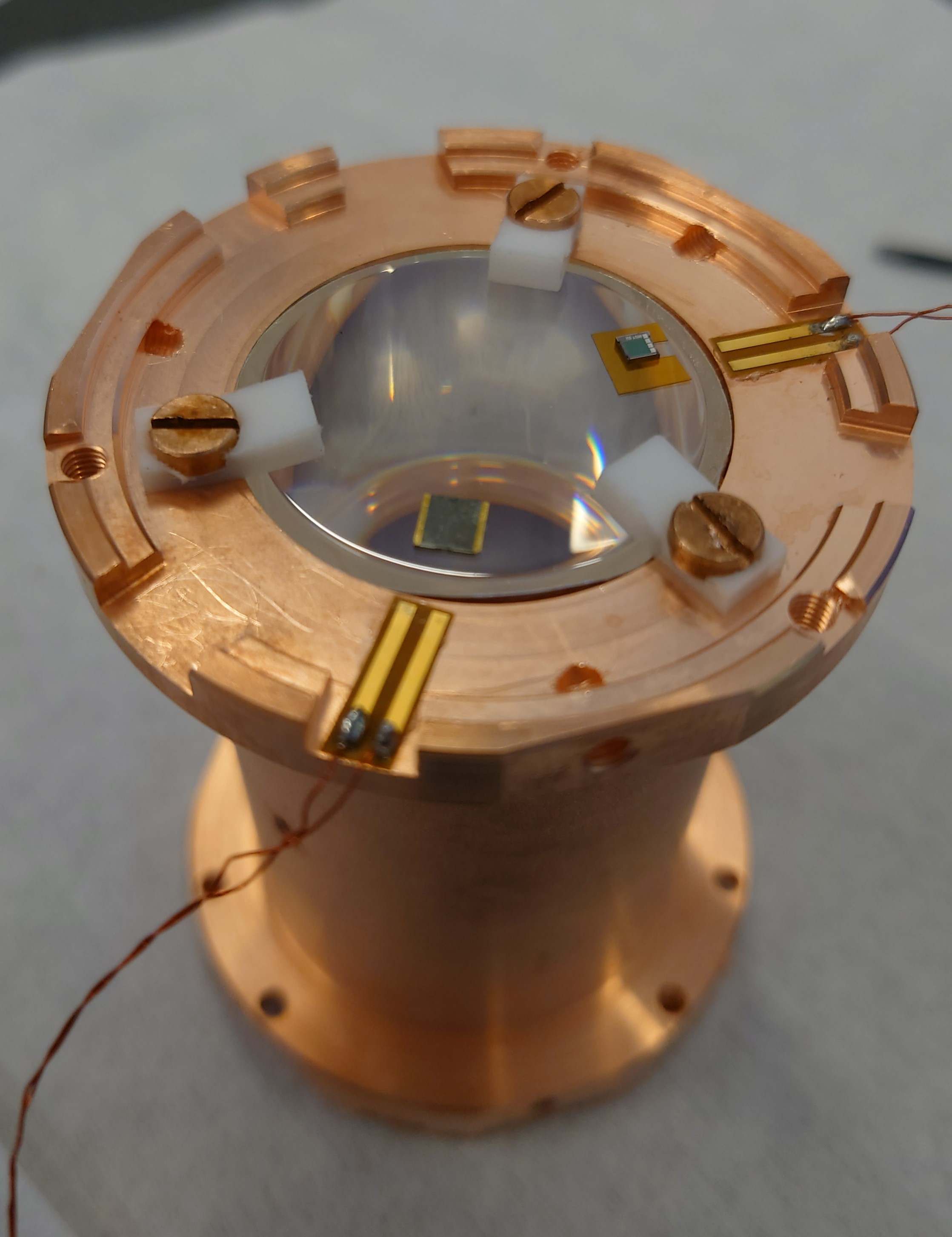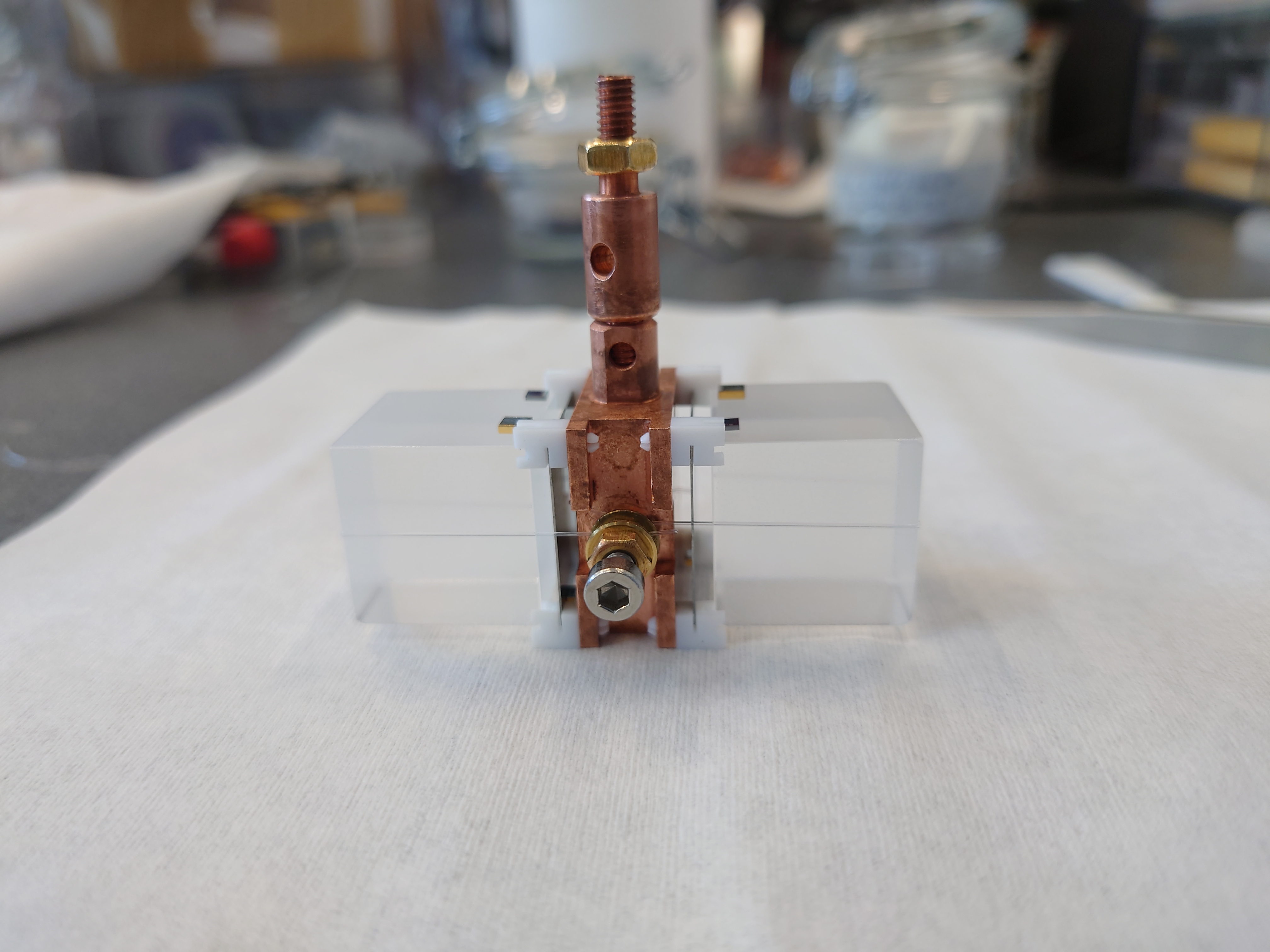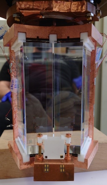 The first mini nylon assembly. Two Li2MoO4 crystals are fixed using nylon wire and PTFE pieces. Each detector is facing a square light detector that is sandwiched between the PTFE pieces.