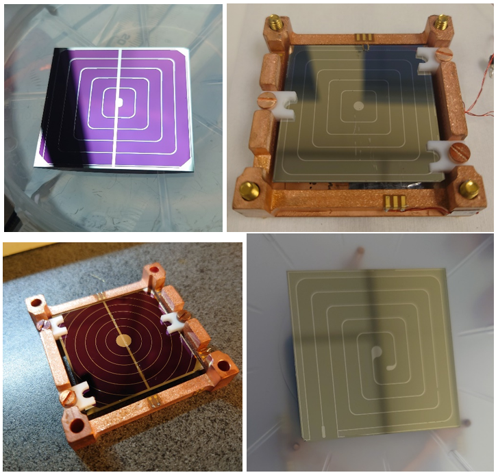 Neganov-Luke light detectors. Top left: concentric square electrodes with rounded corners deposited by evaporation (the voilet color is SiO deposited on the wafer to increase light collection). Top right: concentric square electrodes with rounded corners deposited by lithography. Bottom left: concentric ring electrodes deposited by evaporation. Bottom right: double meander electrodes deposited by lithography.